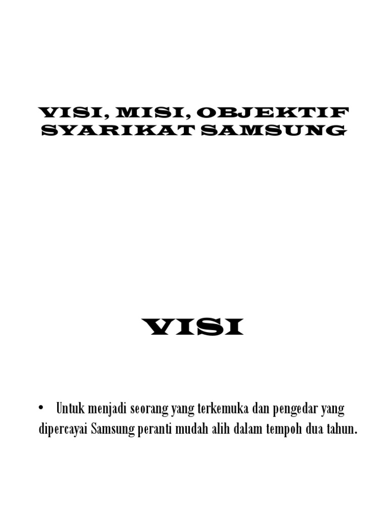 Visi Misi Dan Objektif Syarikat Samsung : Samsung adalah salah satu konglomerat (chaebol) korea selatan terbesar yang bermula sebagai perusahaan ekspor pada tahun 1938 dan dengan cepat berkembang ke bidang lainnya.. Visi dan misi menjadi suatu hal yang paling pokok agar seluruh anggota dalam organisasi atau lembaga tersebut mempunyai titik fokus yang sama. Visi dan misi menjadi hal pokok, supaya semua anggota suatu lembaga atau organisasi memiliki fokus yang sama. Contoh visi dan misi calon kepala desa. Efektif untuk optimalkan penjualan dan revenue yang maksimal. Tidak seperti objektif yang menjawab, bagaimana ia dapat dicapai?